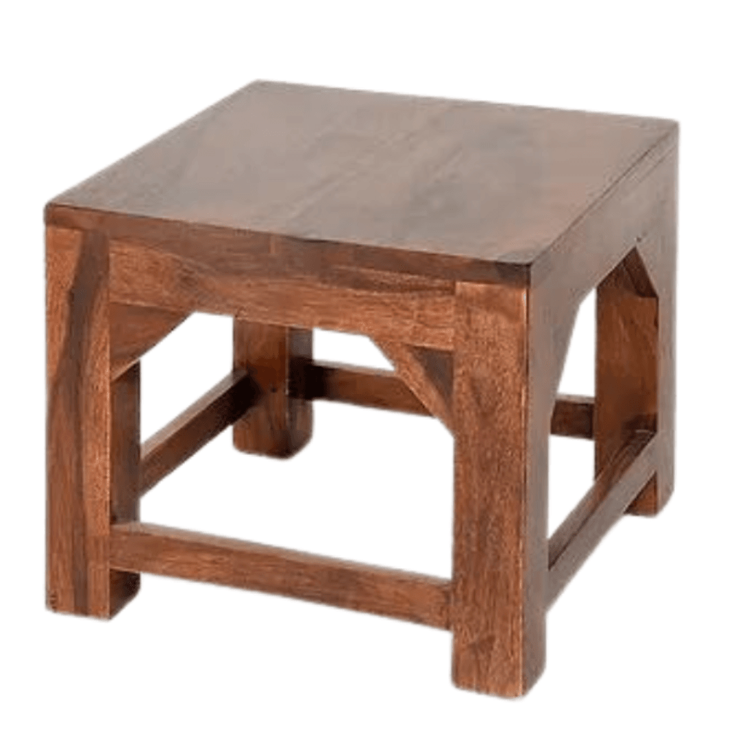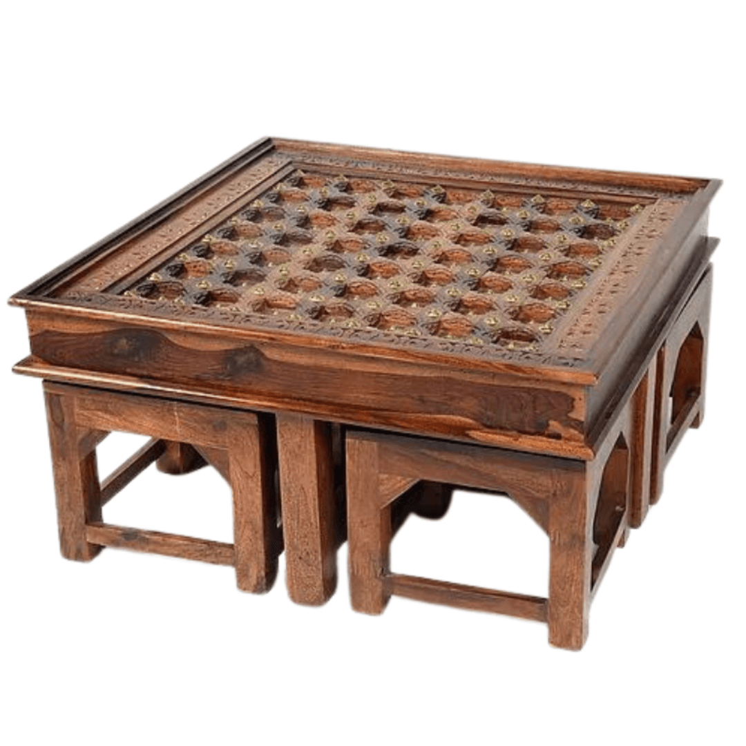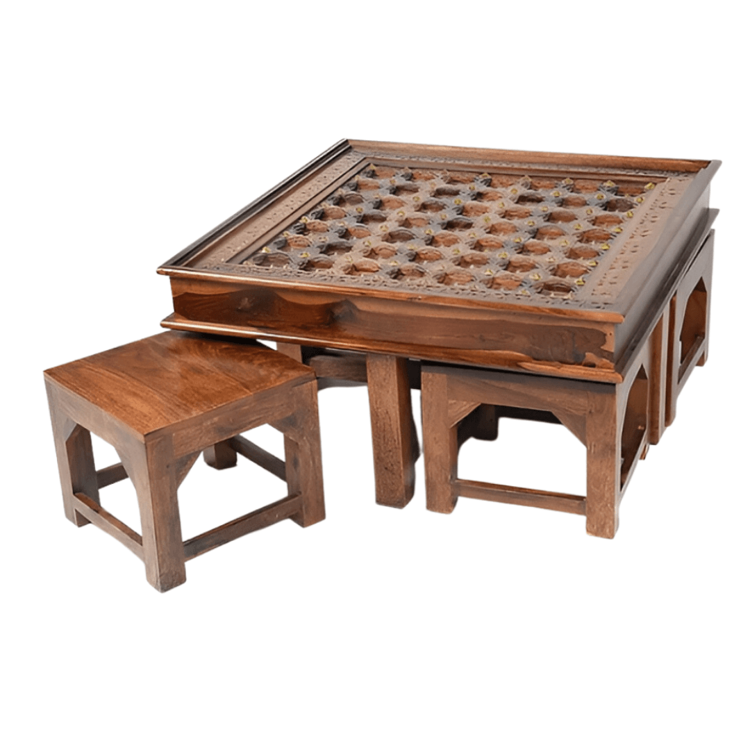 The coffee table set is available in three finish options—honey, walnut, and natural (no stain)—to complement various interior styles, from modern to traditional. Each finish is lacquer-based, enhancing the wood’s natural shine while protecting it from wear and tear. The sturdy construction, coupled with the inherent tensile strength of Sheesham wood, ensures the table and stools remain stable and reliable even with regular use.